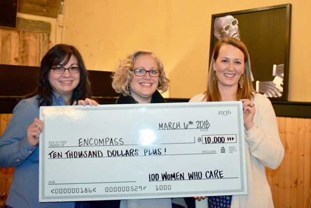 Encompass Grants Manager Laurie Gutenberg, Development Director Lisa Yamasaki, and Board Member Erika Ribary accepted the check from 100 Women Who Care at their March 6th meeting.