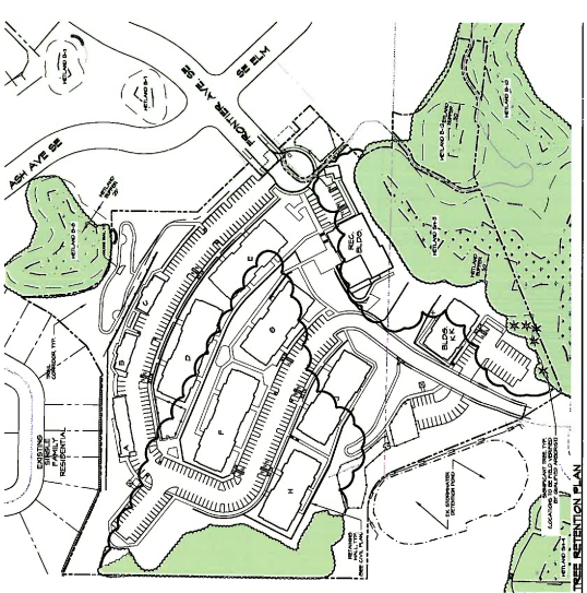 DevCo is proposing the 191 units be spread over ten multi-family buildings of various sizes and number of units ranging from one to five bedroom floor plans.  As S-20 is a sloped property, at the top where it adjoins an existing single-family home neighborhood, two-story over garage carriage houses are proposed in order to blend. Larger three and four-story buildings would be set on terraces down the property’s slope. The complex would also have an on-site recreation and leasing center. Conceptual sketches show a pool included in the rec center. According to the application, the distribution of buildings, parking, recreation and landscaping would create a campus-like setting.