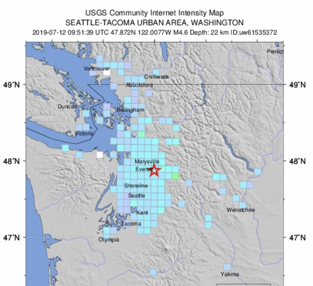 A 4.6 magnitude earthquake centered about 2 miles northwest of Monroe, WA shook many Snoqualmie Valley residents awake early Friday morning, July 12, 2019.