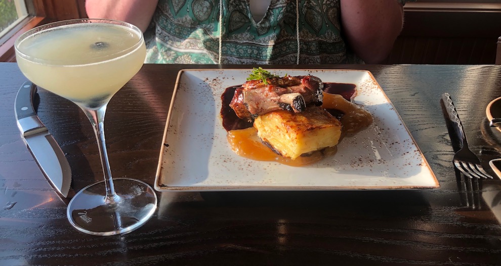 The main course was an even bigger Sophie’s Choice. I considered the Ratatouille Vol-a-Vent but in the end went with the Salmon Creek Farms Duroc Pork Chop (I think the last time I had a pork chop was 1977) with white cheddar gratin, Salish honey candied apple, spruce tip brine and apple brandy demi-glacé. Danna chose the Alaskan Halibut with cocoa butter, white miso, Salish honey, black vinegar, baby potato, dinosaur kale and radish sprout, saying that no one in her family likes seafood so she might as well take advantage of the chance to eat it now.