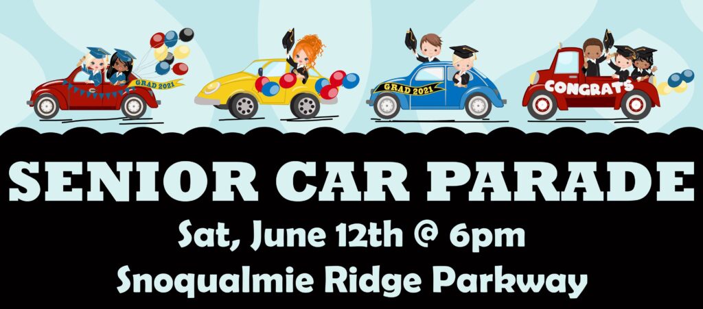 On Saturday, June 12th, join the community and families of the Snoqualmie Valley School District’s Class of 2021 for a car parade. Dirtfish Rally School is kindly providing a staging area for the vehicles and driving the lead pace car. Seniors, wearing their caps and gowns, will be driven up the parkway in decorated cars for spectators to congratulate and cheer on!