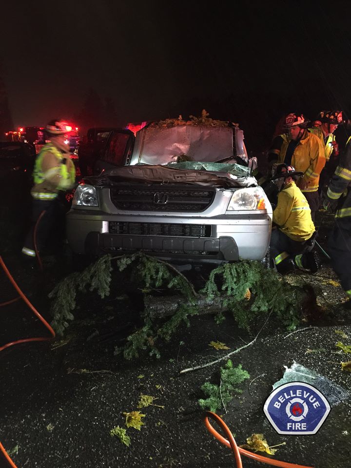 Around 6PM she merged onto I-90 from 405 and was starting to speed up when she heard the sound. When she woke up a few seconds later, the roof of her car was buckled and was sitting where the windshield should be. A tree had come through the windshield and was laying across the passenger seat – about six inches from her head. She was trapped, with her right leg pinned under the steering wheel.