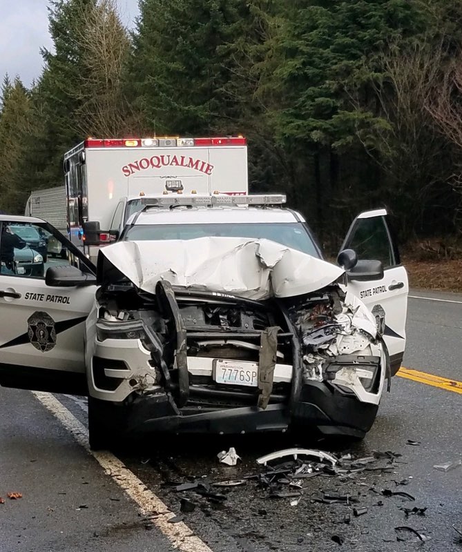 According to the Snoqualmie Fire Department, the WSP Commercial Truck Enforcement Officer involved in the collision struck the back of the a semi truck that was slowing down.