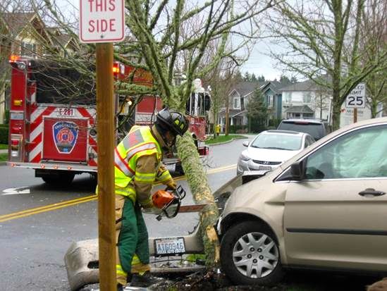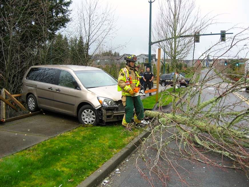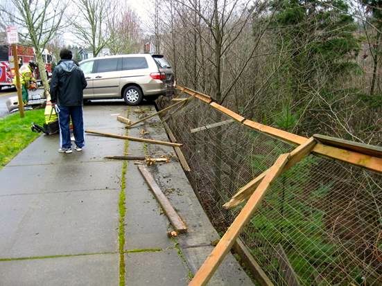 Driving by the scene of a Friday car accident, near the intersection of Snoqualmie Parkway and Jacobia Street, it’s clear something serious occurred in the Aster Creek neighborhood.  The pedestrian fence that protects residents from an embankment on Jacobia Street sits heavily damaged – and a tree that once stood is gone.