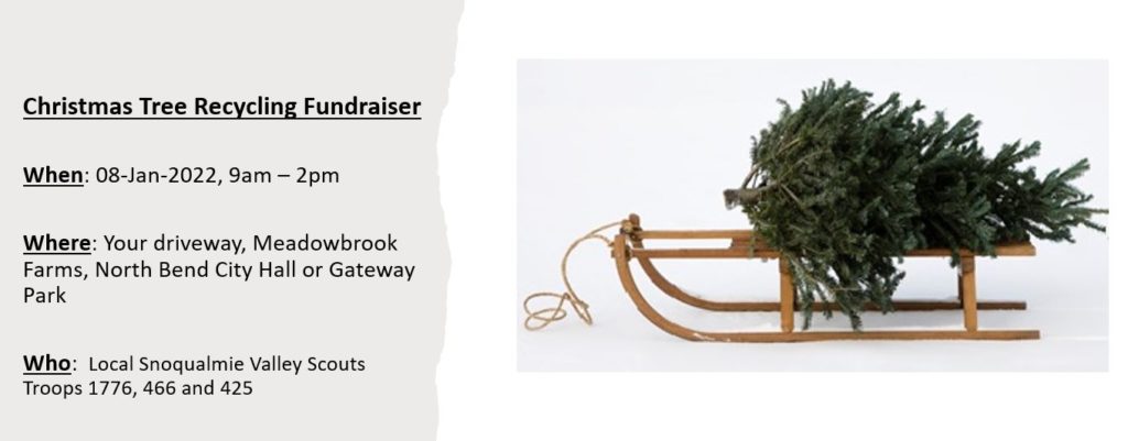 • Pickup service is being limited to specific neighborhoods in North Bend, Snoqualmie, and Fall City. If you are in their pickup zone, they have left an envelope on your door hanger. Please follow the instructions on the envelope and leave your tree at the end of your driveway by 9am on Saturday, January 8. Tree MUST be clear of ornaments, lights, tinsel etc. or it will not be picked up.