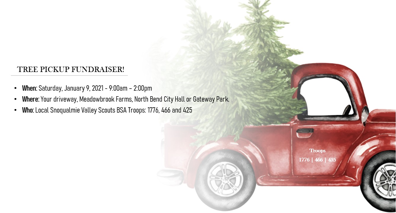 - If you are NOT in the pickup zone, you may drop your tree for disposal at either Meadowbrook Farms (1711 Boalch Ave, North Bend), North Bend City Hall (922 SE Cedar Falls Way), or Gateway Park in Snoqualmie (this is the tree lot located at the corner of Snoqualmie Parkway and SR202).