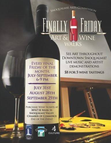 This is the first in a series of three ‘Finally Friday Art and Wine Walks.’ They happen the last Friday of the month through Septmember 2015. The event is sponsored by the Snoqualmie Arts Commission, the Snoqualmie Valley Chamber of Commerce, and King County 4Culture.
