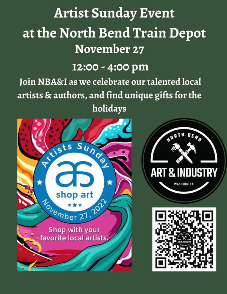 This year North Bend Art & Industry will be holding an Artists Sunday event at the North Bend Train Depot on Sunday, November 27, from 12-4 pm. Here you will be able to visit some of the talented local Snoqualmie Valley artists and authors, view and purchase their amazing work, and enjoy music by Eva Stokes. The train depot is located at 205 McClellan St, North Bend, WA, 98045.