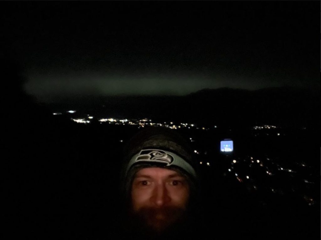 My cell reception cut out around the first switchback, but around the 1/4 mark, I received a message that a G1 threshold had been reached! That essentially means it’s about to go down in Aurora Chasing terms. At this point, I am determined and start making tracks. In all, it took me precisely 59 minutes to arrive at the lowest landing closest to town