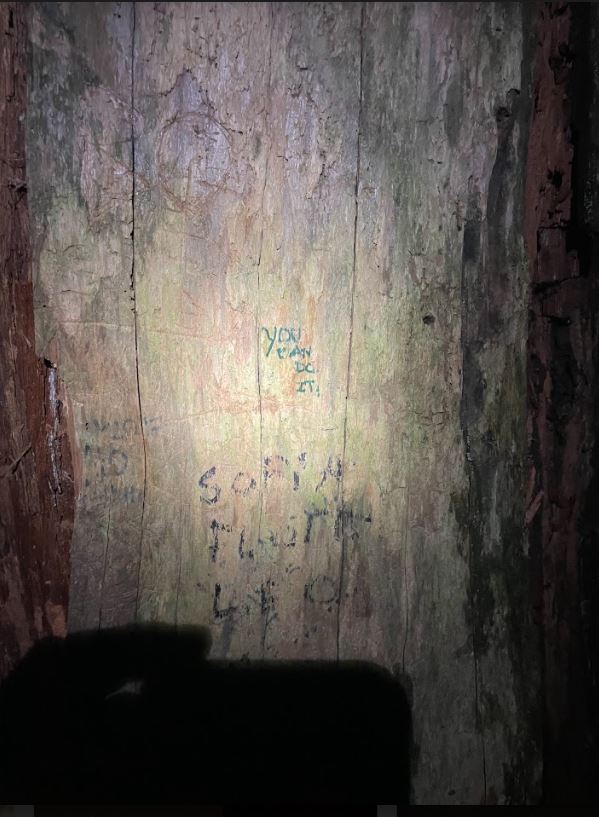 About a quarter of the way down the trail, I stop to take a pic of a cool tree that says “you can do it” in Sharpie. That’s when the hair on the back of my neck stood straight up! I lowered my phone, placed my right hand on my gun’s safety, and slowly pulled my sidearm. I could hear and smell everything; my sinuses were so clear I could smell the water from the creek a ways away.