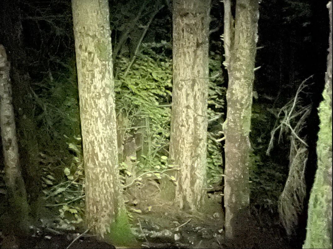 At this point, the underbrush was getting thick, so I could hear her very well even though I was still moving and breathing heavily. The fog was settling in, and I had very little visibility! She was back above me on the trail, so I kept my light trained on the sounds in the woods and backed my way out until I got down past the washouts and the newly fallen trees. Finally, I can’t hear her or pick up any trace she follows.