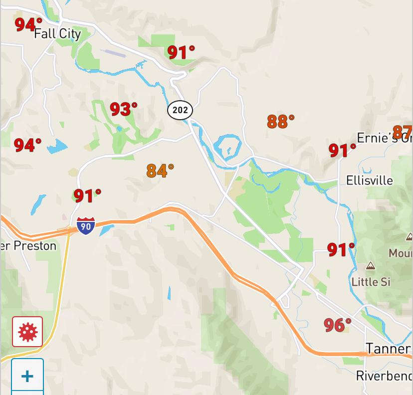 The 90°’s heat is still expected to be short-lived, limited to just today. The central WA coast (Ocean Shores) was lovely, just barely reaching 80° today.