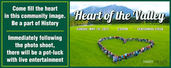 You may have seen the picture last year. Hundreds of Snoqualmie Valley community members showed up at Centennial Fields and made the outline of a gigantic heart. Mary then had a fire truck hoist her high above the scene, capturing her “Heart of the Valley” iconic picture, with Mt. Si filling in the background.