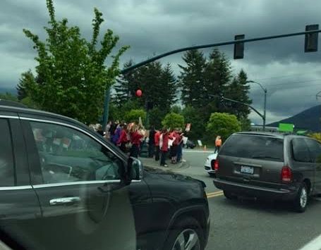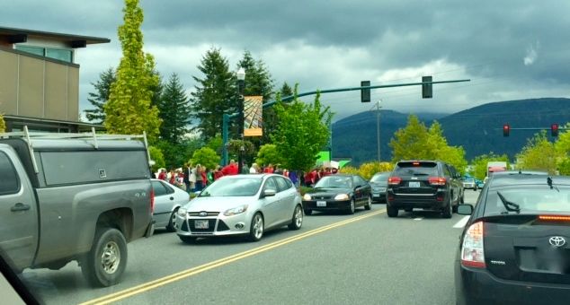 Paving work at the intersections of Snoqualmie Parkway and Douglas Ave and Snoqualmie Parkway and Fairway Ave, plus the annual Snoqualmie Ridge Community-wide Garage Sale, PLUS a Snoqualmie Valley teachers march/rally protesting state lawmakers’ inability to fully fund education per state a mandate created a perfect storm and an ensuing traffic nightmare on Snoqualmie Parkway, Friday afternoon, May 15, 2015.