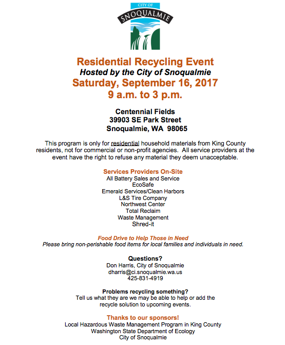 Snoqualmie Fall Recycling Event happens on Saturday, September 16th from 9AM to 3PM in the parking lot of Centennial Field, 39903 SE Park Street.