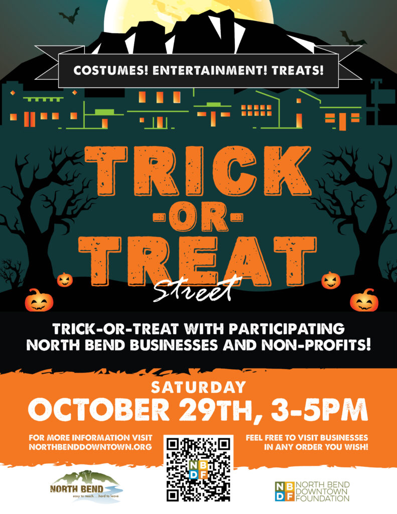 The North Bend Downtown Foundation is excited to announce the 5th Annual Trick or Treat Street event on Saturday, October 29th, from 3:00 – 5:00 pm. The NBDF is dedicated to creating family-friendly fun for the community!