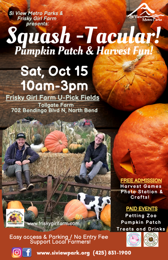 It’s harvest season! In partnership with Frisky Girl Farm, join Si View Metro Parks for a new seasonal celebration: Squash-Tacular! On Saturday, October 15th, the Frisky Girl u-pick pumpkin patch will have lots of additional activities for farm visitors. They’ll have outdoor harvest games, a photo station and a craft booth – all free.