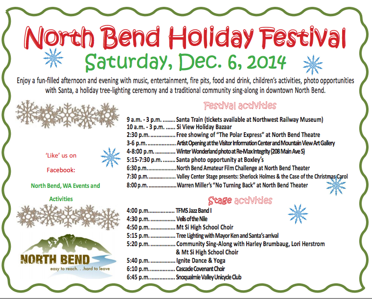 North Bend will also kick off the Holiday Season on Saturday, December 6th, at its annual North Bend Holiday Festival from 4PM – 8PM. North Bend Way through downtown will shut down and the street transformed into holiday scene.