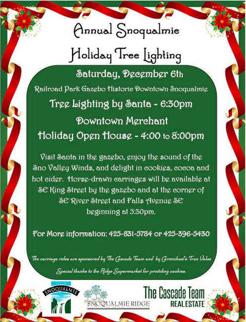 The City of Snoqualmie will hold its annual Holiday Tree Lighting Event. The festivities kick off Saturday, December 6, 2014, at 5:30PM with horse-drawn