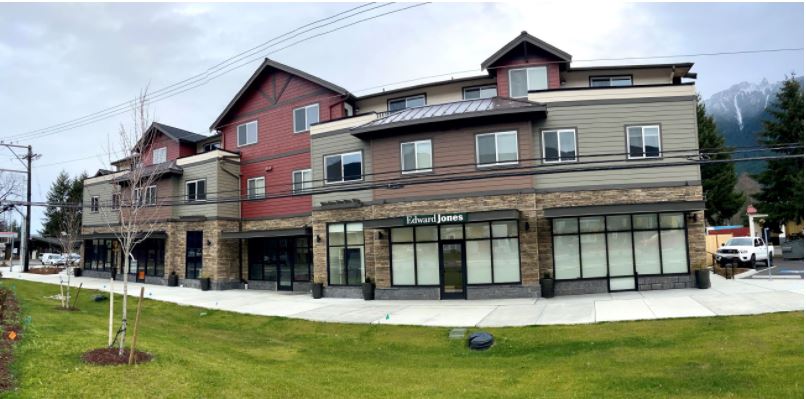 The nearly 35,000 sq. ft., three-story building includes approximately 5,000 sq. ft of street level office/retail space, parking garage, 37 apartments on the second and third stories, as well as a new path connecting North Bend Way to Torguson Park. According to the project’s construction manager, most apartments are 1 and 2-bedroom units.