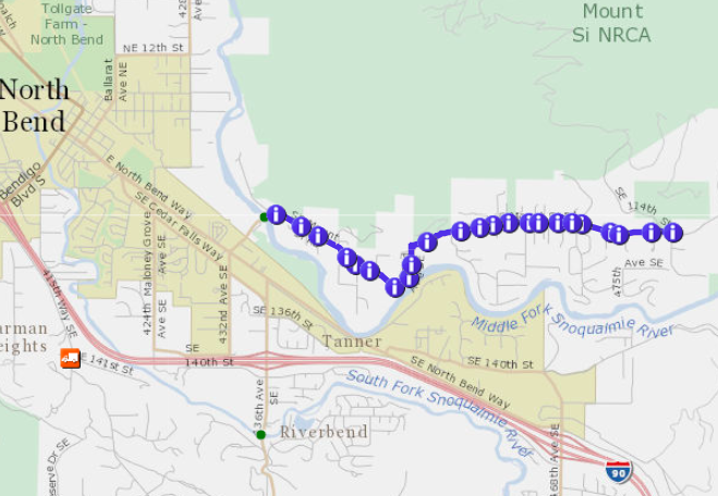 In blue – section of Mt Si Road that will be getting repaved beginning 4/20/18.