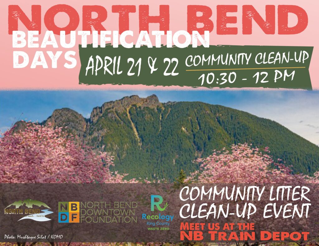 Start: Gather at 10:30 a.m. at the North Bend Train Depot. Join the city’s efforts in various clean-up and beautification projects, led by Mayor Miller and supported by the North Bend Downtown Foundation, Recology King County, and businesses.