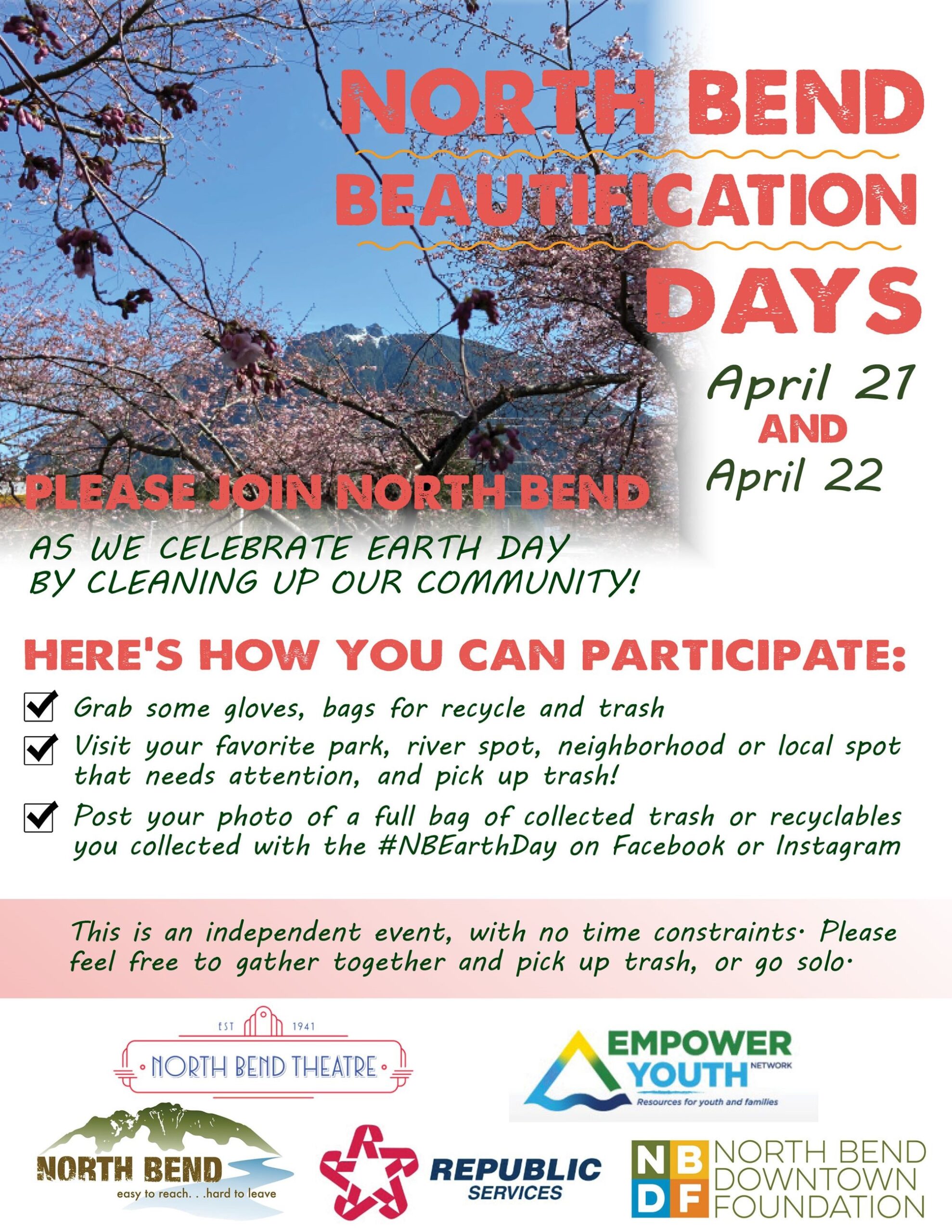 City council and staff, the North Bend Downtown Foundation, Republic Services, Empower Youth Network, the North Bend Theatre, and many others are teaming up to clean areas of North Bend those same two days, and residents are invited to join in.