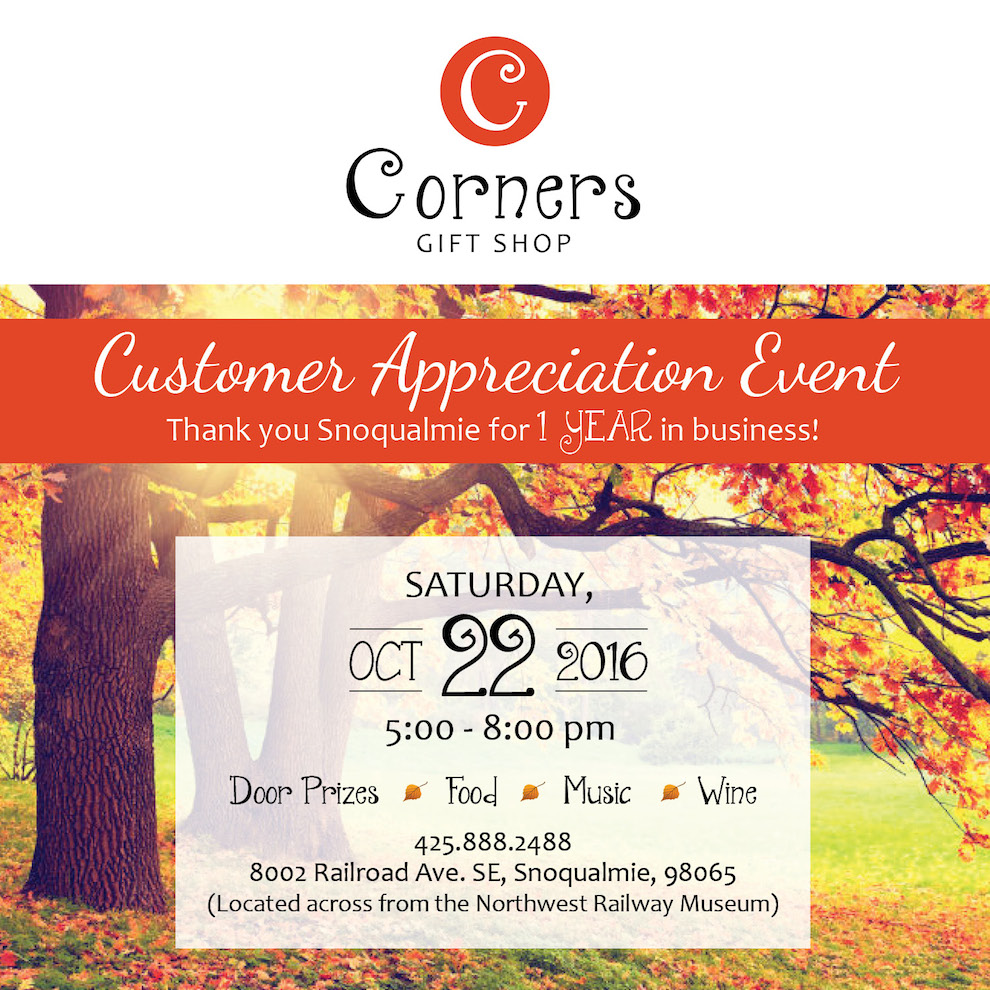 As a big ‘Thank You,’ on Saturday, October 22, 2016 from 5PM-8PM Peggy (and Corners) will host a Customer Appreciation Event that includes food, music, wine and door prizes.