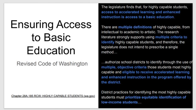 The district did not document its proposed plan of action in response to the audit nor allow a period for public comment on the documented changes, as is normal for a public body. The SVSD Highly Capable services are a result of the Washington State Administrative Code (WAC):