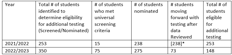 As testing is still being performed by the district of both nominated and screened students, this review of nominations excludes verses providing universal and equal access to services – as required by WAC.