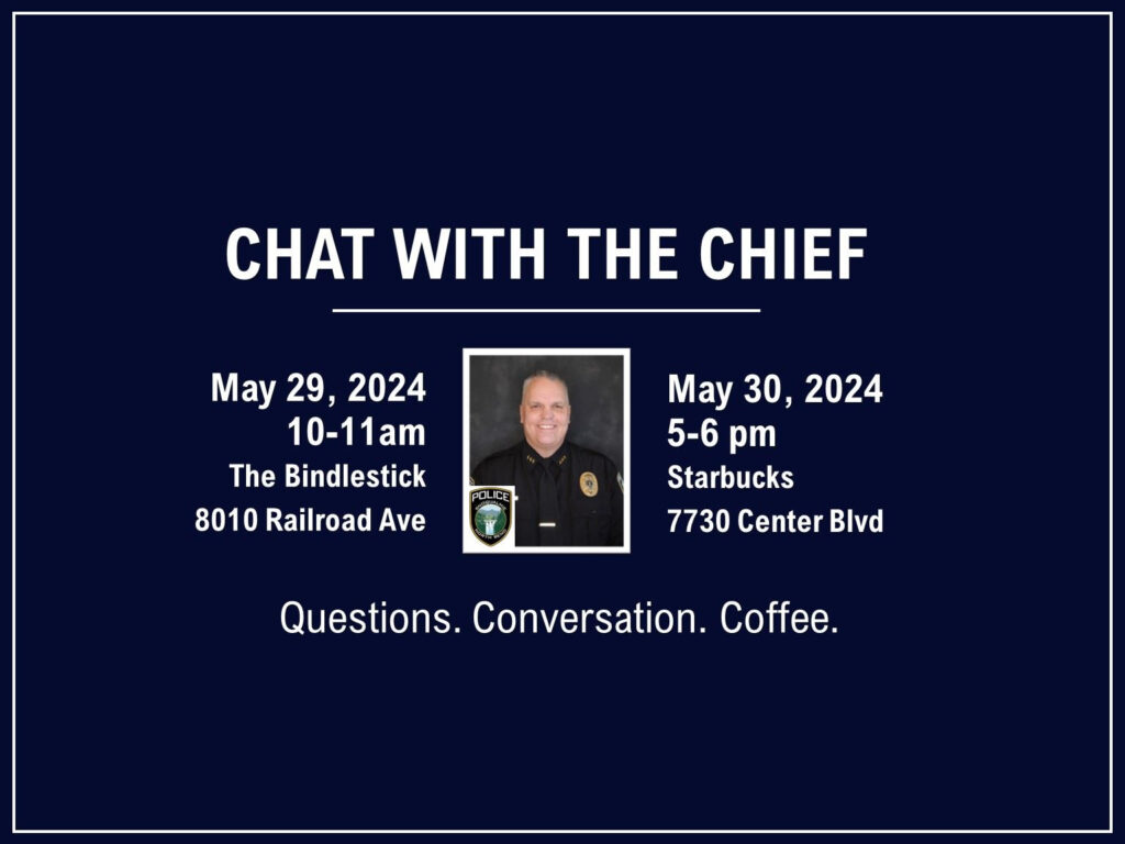 The second Chat with the Chief event will be held at the Snoqualmie Ridge Starbucks at 7730 Center Blvd SE (next to the Dollar Tree store), on May 30, 2024, from 5 p.m. to 6 p.m.