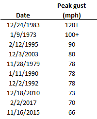 I’ve compiled a Top-10 list ranking historical Cascade gap windstorms (as measured from anemometers in the vicinity of Enumclaw or North Bend):
