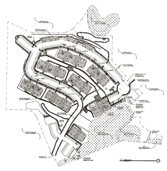 DevCo is proposing the 191 units be spread over ten multi-family buildings of various sizes and number of units ranging from one to five bedroom floor plans. As S-20 is a sloped property, at the top where it adjoins an existing single-family home neighborhood, two-story over garage carriage houses are proposed in order to blend. Larger three and four-story buildings would be set on terraces down the property’s slope.