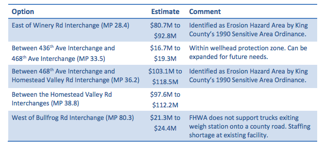 Over the summer the state evaluated five possible state-owned locations, all along eastbound I-90, as the state says the westbound direction is already served by a station in Cle Elum and the eastbound weigh station near Cle Elum “has not been in regular operation for several years due to poor sight distance, inadequate queue storage, and staffing shortage.”