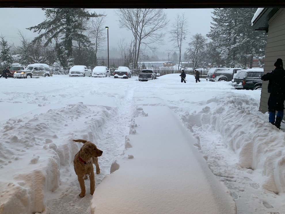 The Snoqualmie Valley received approximately 6 inches of snow Sunday night, followed by another, more potent storm Monday afternoon that did not transition to rain as it did in other Puget Sound areas, with snow continuing all night. Residents were waking to snow drifts Tuesday morning – courtesy of strong east winds. Combined with snow still on the ground from last week’s snow, it is possible some places now have two plus feet of snow.