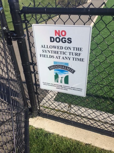 Now that the land is a City of Snoqualmie Park, city leash laws apply – as they do at all parks except Three Forks Dog Park. Signage at Jeanne Hansen Park, which some say is bit limited, also states that dogs should be leashed and are not allowed on the park’s two synthetic turf fields – but the signs don’t specifically address the large grass field where Simone’s encounter occurred – and where dogs are often seen off-leash.