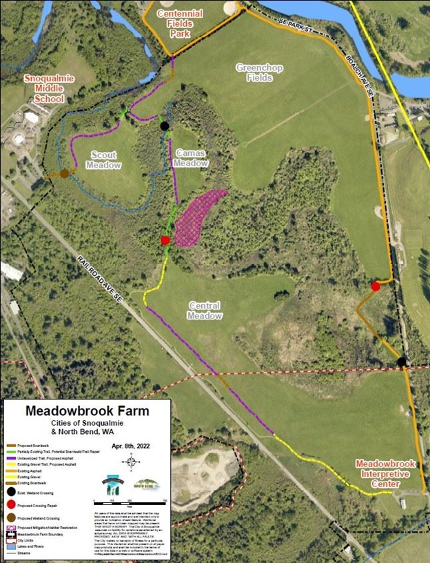 The loop trail will connect from the Meadowbrook Farm Interpretive Center north through the fields, forests, and wetland areas of Meadowbrook Farm to connect to Centennial Fields Park, with a spur trail connecting to Snoqualmie Middle School.