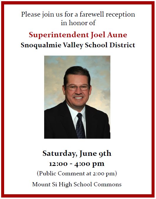 As the Snoqualmie Valley School District prepares to say farewell to Superintendent Joel Aune after 13 years of service, they’ve planned a celebration in his honor and everyone is invited to the special event.