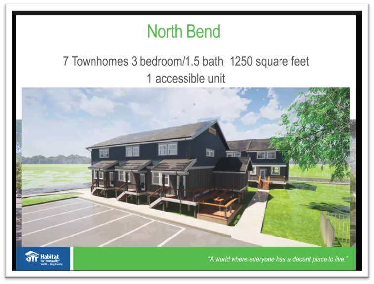 Habitat for Humanity Seattle-King County anticipates starting construction this summer on its new townhome community located near the intersection of E. 2nd Street and Janet Ave in downtown North Bend. Each of the seven 1,250 sq. ft. townhomes will have 3 bedrooms and 1.5 bathrooms.