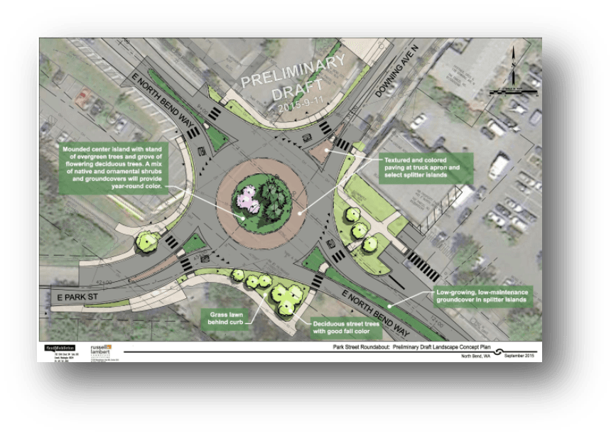 The Park Street Roundabout is one of five roundabouts in the works for North Bend in the coming years. A 3-leg roundabout is also planned for North Bend Way and 436th Ave; another one is possible at 436th and 136th Street; another at Middle Fork Road/140th ST/468th Ave near Twin Falls Middle School; and one more is being considered at the intersection of West 4th Street and Bendigo Blvd.