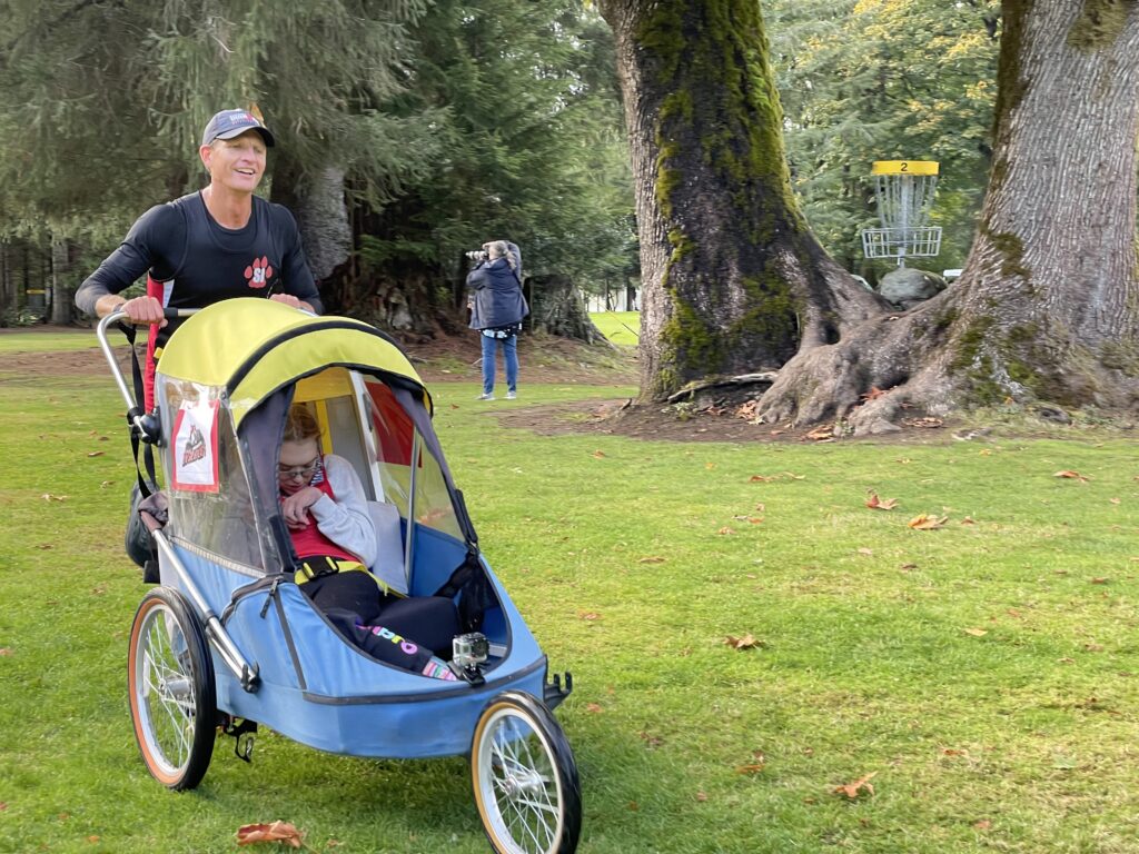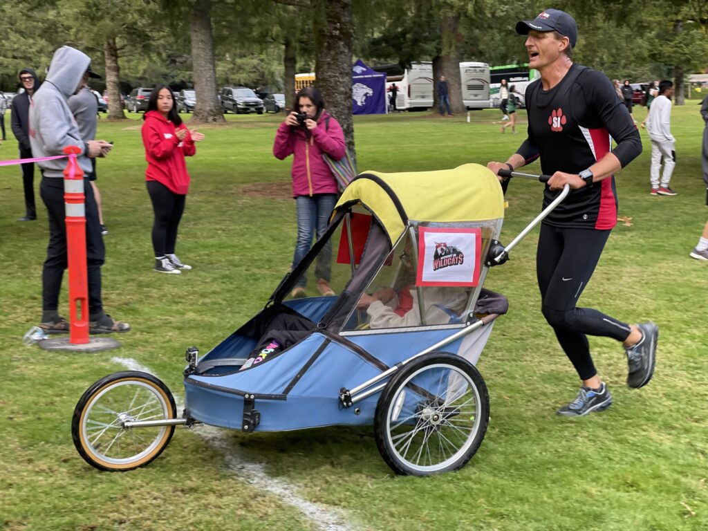 Ellie attended practice every day and joined in with warm-ups, stretching, and running. Teacher Dave Preston noted that everyone was a little surprised to see a big jogging stroller show up at practice and the meet. Still, everyone was immediately accepting of Ellie’s participation.