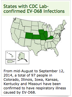 The Center for Disease Control says from mid-August to September 12, 2014, a total of 97 people in six states were confirmed to have respiratory illnesses caused by EV-D68. [Most often, testing is not performed unless patients require hospitalization for symptoms.]