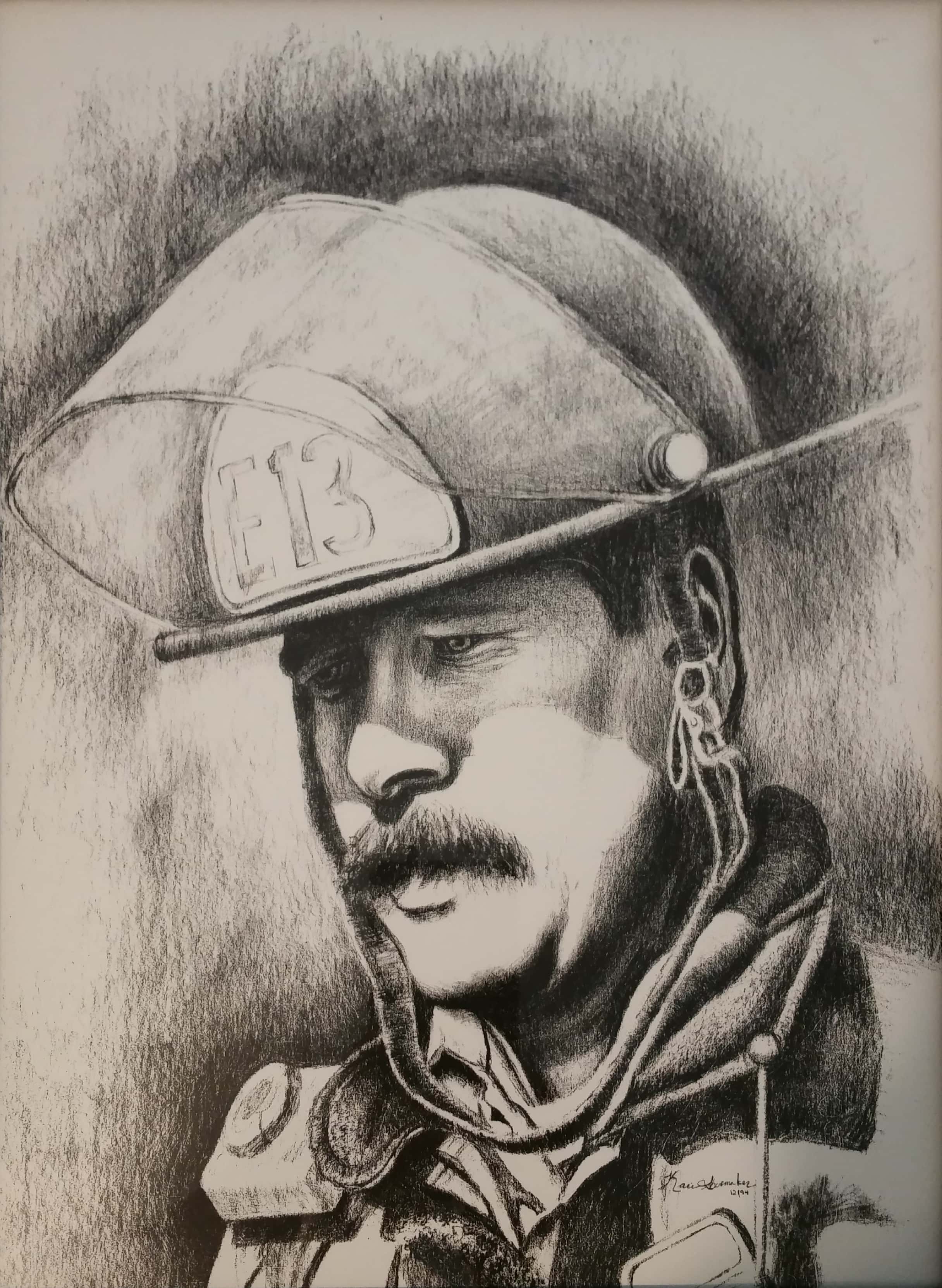 Lt. Shoemaker is pictured below. The picture was hand sketched by Amy’s younger sister and given to him two-weeks before the fire. Lt. Shoemaker was so proud of the sketch that he drove around with it in the fire truck, showing it to everyone saying “look what my daughter drew.”