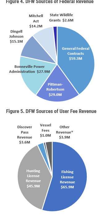 According to the WDFW’s 2018 Longterm Funding Plan, department funding comes from six main sources: federal, user fees, state and local contracts, state bonds and license plates. User fees alone are approximately 23% of the DFW’s spending, with a major portion of that coming from hunting and fishing licenses.