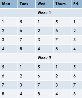 Students would take eight 80-minute classes per year that meet on alternating days throughout the school year, taking four classes each day. For example, on Monday students would be in periods 1-4, then the following day in classes 5-8. The alternating block would continue into the following week – so if they ended the week with periods 1-4, the next Monday would start with periods 5-8. Classes would be shortened on Fridays for early release day.