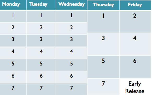 Students would take seven, 48-minute classes three times per week (i.e. Monday – Wednesday). Then twice per week (i.e. Thursday and Friday) they would take three or four 85 minutes classes. Friday would have 3 periods to accommodate early release day.
