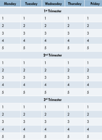 Students would take five 70-minute classes day in a one trimester course. The school year would be composed of three semesters. Some courses would be three trimesters long or 1.5 credits. Classes would be shortened on Fridays for early release.