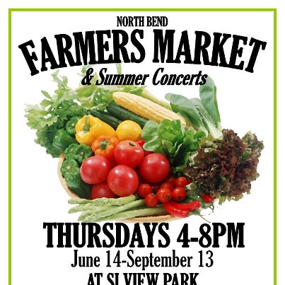 The North Bend Farmers Market serves the greater Snoqualmie Valley community, bringing together local farmers, artisans and shoppers with a weekly, open-air market throughout the summer. Market hours are 4:00PM-8:00PM every Thursday through September 13th. Check out www.facebook.com/NorthBendFarmersMarket for the latest market updates.