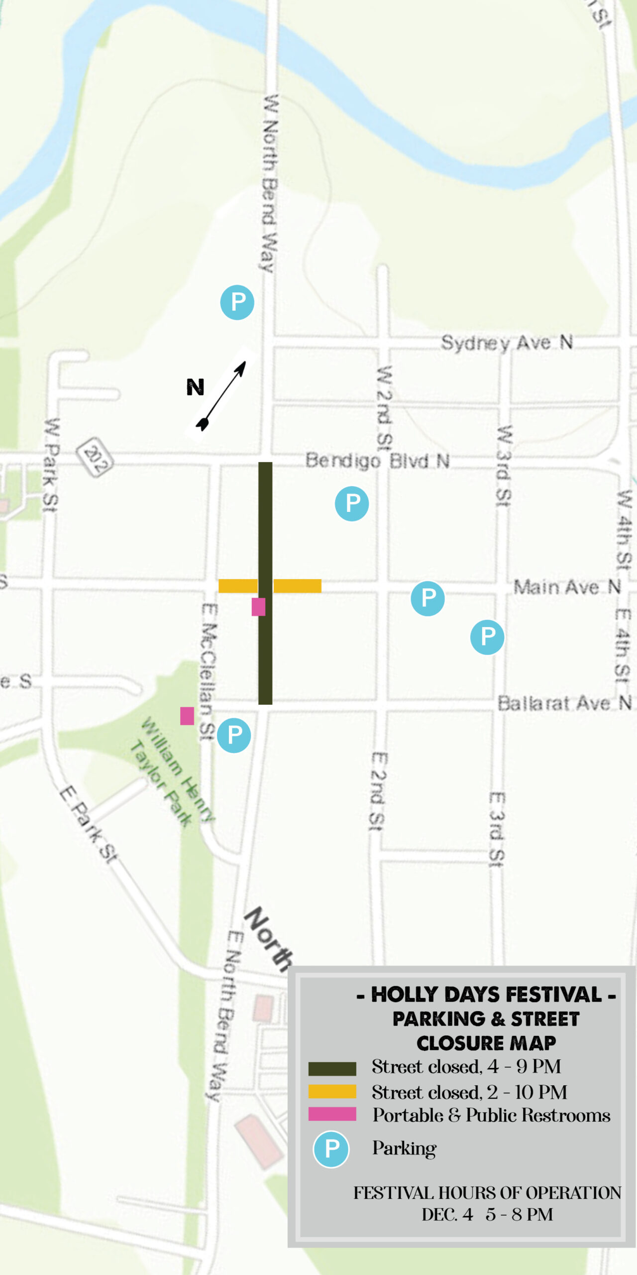 A portion of North Bend Way and Main Ave will be temporarily closed: North Bend Way, between Bendigo Boulevard and Ballarat Ave, from 4 PM to 9 PM and Main Ave, between East McClellan Street and 107 Main Ave N, from 2 PM to 10 PM.