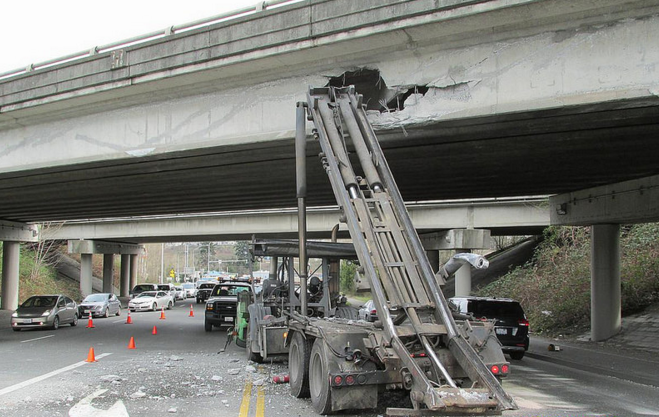 Look up as you drive north on Front Street in Issaquah and there it is: a chunk of concrete missing from the Interstate 90 overpass caused when a garbage truck punched a hole in a bridge girder above Front Street in March 2015.